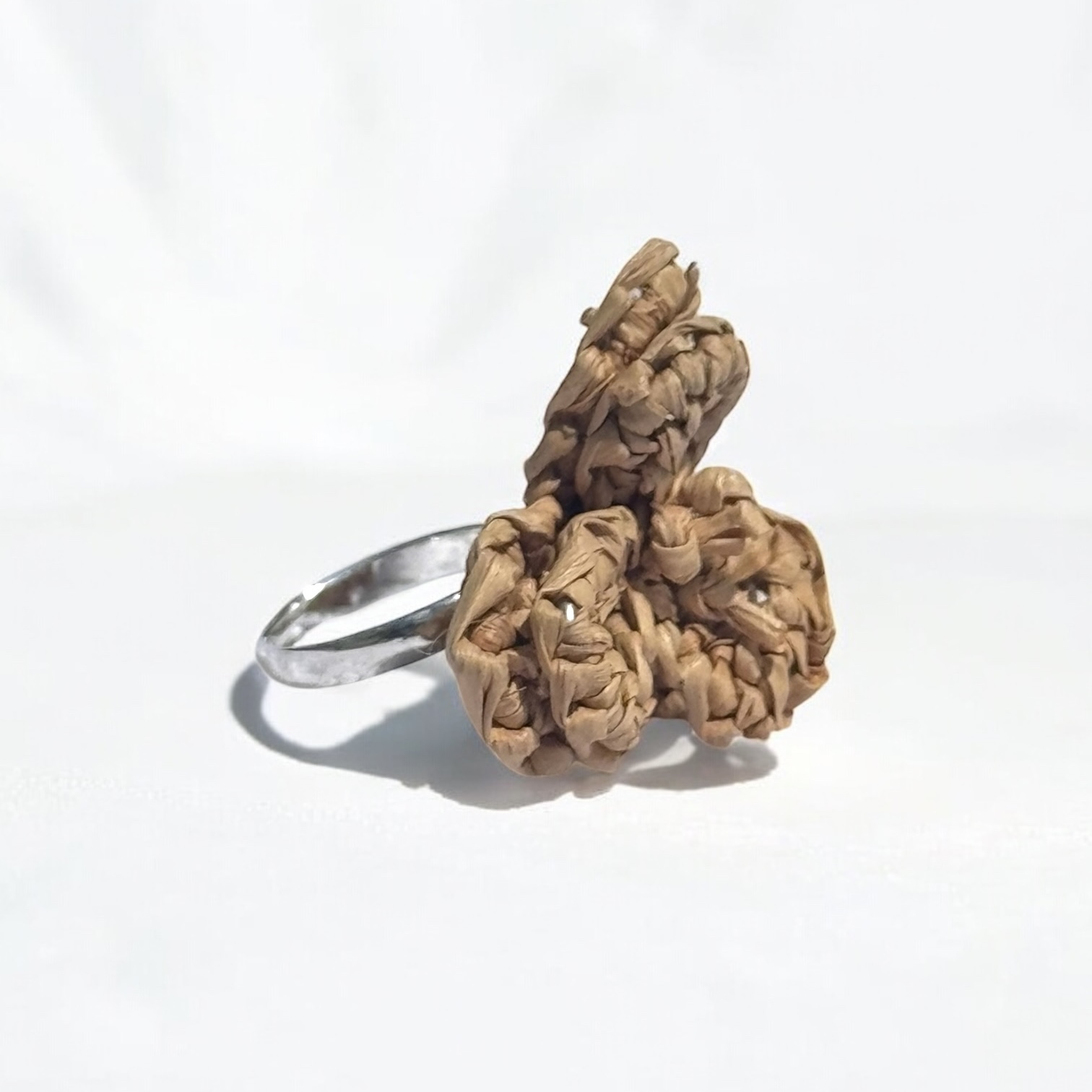 Anillo con flor doble tejida a mano en paja toquilla, una fibra ancestral ecuatoriana. La base está cubierta en plata para un acabado elegante y duradero. Evita el agua, perfumes y golpes para preservar la fibra natural y el brillo de la plata. Cada pieza es hecha a mano, por eso puede presentar ligeras variaciones respecto a la foto. Esa es justo la magia no hay dos iguales.