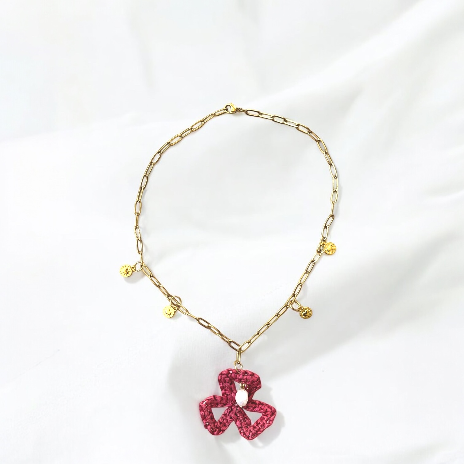 Collar de acero inoxidable dorado con pequeños dijes y flor tejida en paja toquilla al centro. Resistente, hipoalergénico y perfecto para elevar cualquier outfit con un toque artesanal. Evita perfumes, agua salada y golpes fuertes para conservar el brillo y la forma. Cada pieza está hecha a mano, por eso puede presentar ligeras variaciones respecto a la foto. Esa es justo la magia: no hay dos iguales.